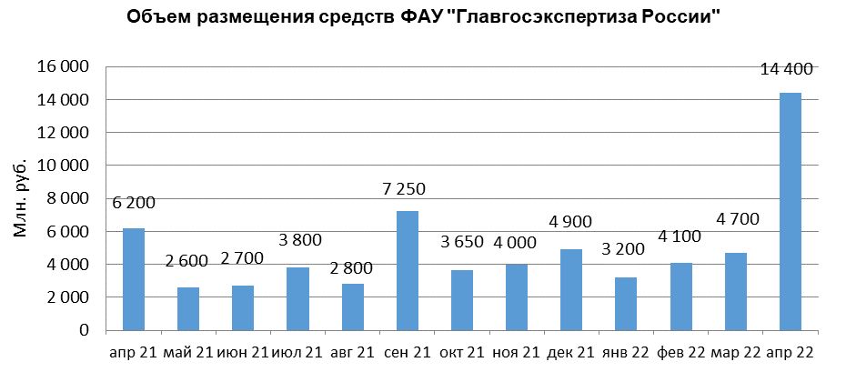 В апреле 2022 г. объем размещения средств ФАУ «Главгосэкспертиза России» в депозиты кредитных организаций с использованием информационных программно-технических средств СПВБ составил 14,4 млрд. руб., в апреле 2022 года - 4,7 млрд. руб.