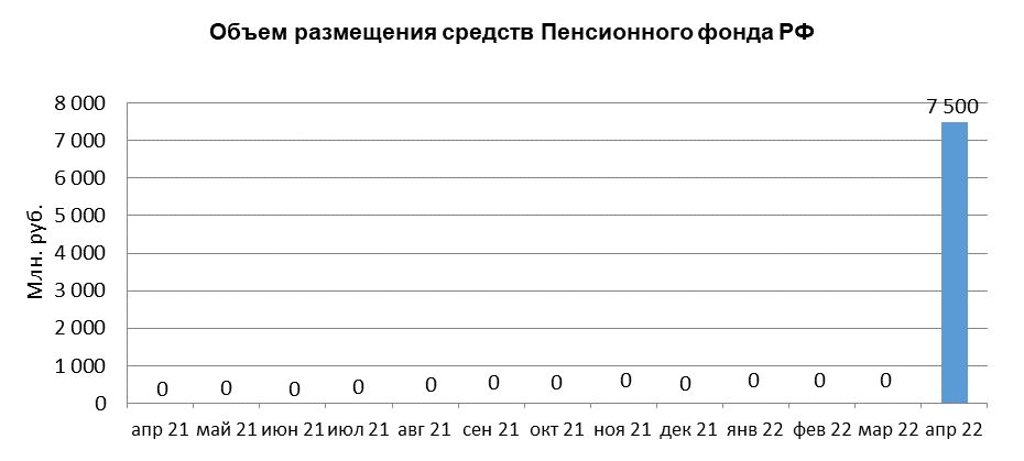 В апреле 2022 года объем размещения средств организации Пенсионный фонд России в депозиты кредитных организаций с использованием информационных программно-технических средств СПВБ составил 7,5 млрд.руб. в марте 2022 года размещение не осуществлялось.