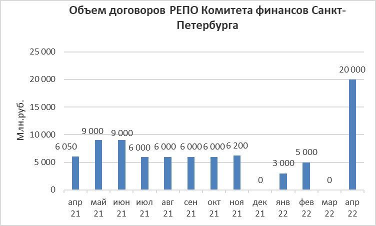 Объем заключенных договоров РЕПО Комитета финансов Санкт-Петербурга с кредитными организациями с использованием информационных программно-технических средств СПВБ в апреле 2022 года составил 20 млрд.руб., в марте 2022 года заключение договоров не осуществлялось.