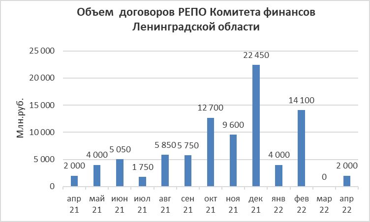 Объем заключенных договоров РЕПО Комитета финансов Ленинградской области с кредитными организациями с использованием информационных программно-технических средств СПВБ в апреле 2022 года составил 2 млрд.руб, в марте 2022 года заключение договоров не осуществлялось.