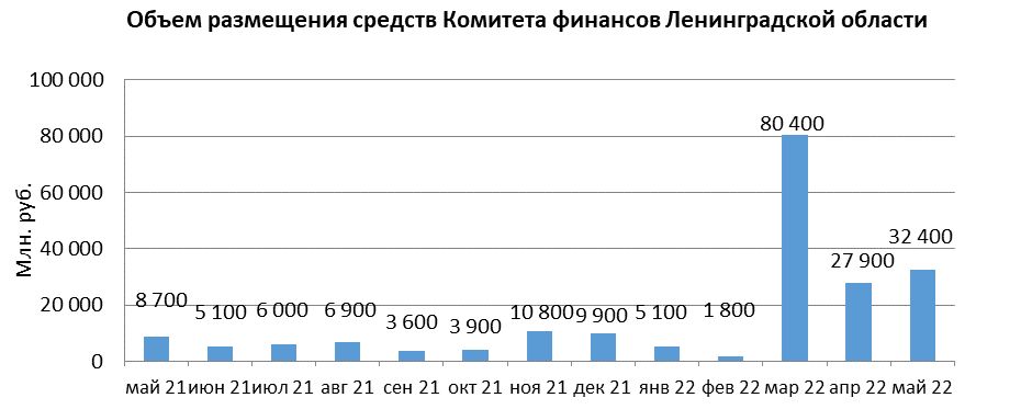 В мае 2022 года объем размещения средств Комитета финансов Ленинградской области в депозиты кредитных организаций с использованием информационных программно-технических средств СПВБ составил 32,4 млрд. руб., в апреле 2022 года – 27,9 млрд. руб.