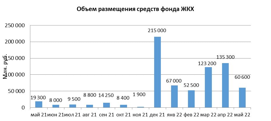 В мае 2022 года объем размещения средств государственной корпорации - Фонд содействия реформированию жилищно-коммунального хозяйства в депозиты кредитных организаций с использованием информационных программно-технических средств СПВБ составил 60,6 млрд. руб., в апреле 2022 года – 135,3 млрд. руб.