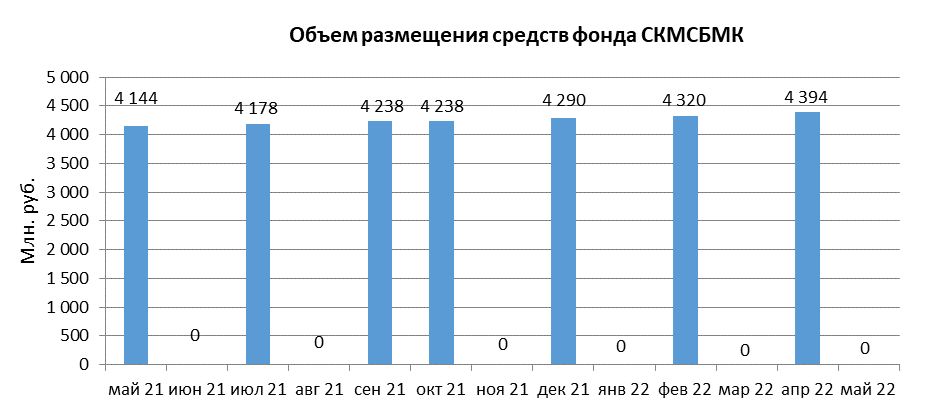 В мае 2022 года размещение средств некоммерческой организации “Фонд содействия кредитованию малого и среднего бизнеса, микрокредитная компания” в депозиты кредитных организаций с использованием информационных программно-технических средств СПВБ не осуществлялось, в апреле 2022 года объем размещения составил 4,4 млрд.руб.