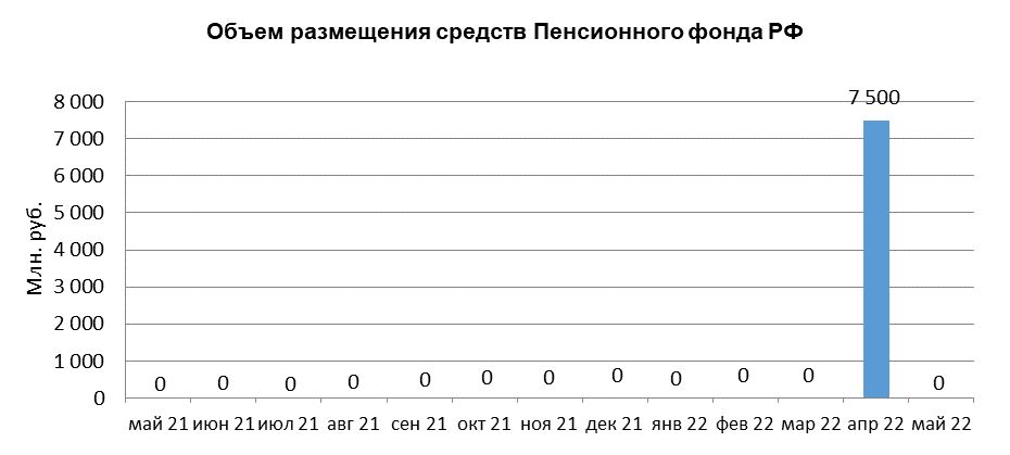 В мае 2022 года размещение средств организации Пенсионный фонд России в депозиты кредитных организаций с использованием информационных программно-технических средств СПВБ не осуществлялось, в апреле 2022 года объем размещения составил 7,5 млрд.руб.