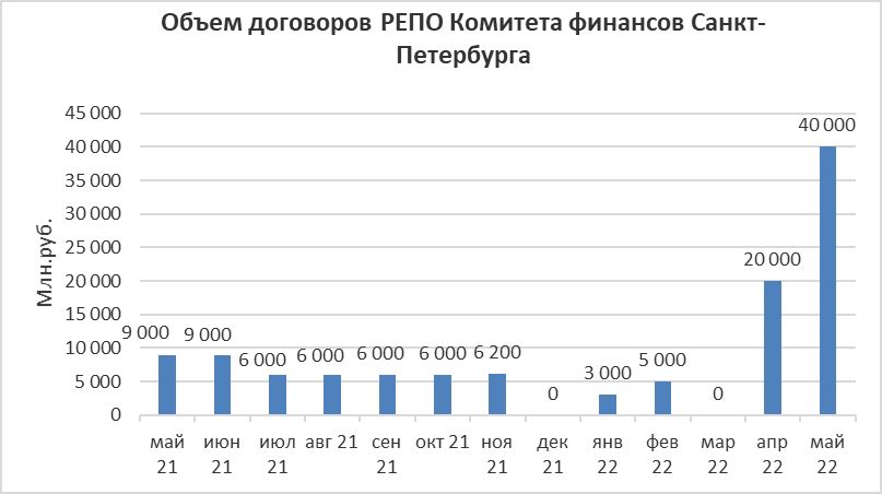 Объем заключенных договоров РЕПО Комитета финансов Санкт-Петербурга с кредитными организациями с использованием информационных программно-технических средств СПВБ в мае 2022 года составил 40 млрд.руб., в апреле 2022 года – 20 млрд.руб.
