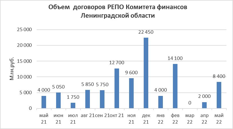 Объем заключенных договоров РЕПО Комитета финансов Ленинградской области с кредитными организациями с использованием информационных программно-технических средств СПВБ в мае 2022 года составил 8,4 млрд.руб, в апреле 2022 года – 2 млрд.руб.