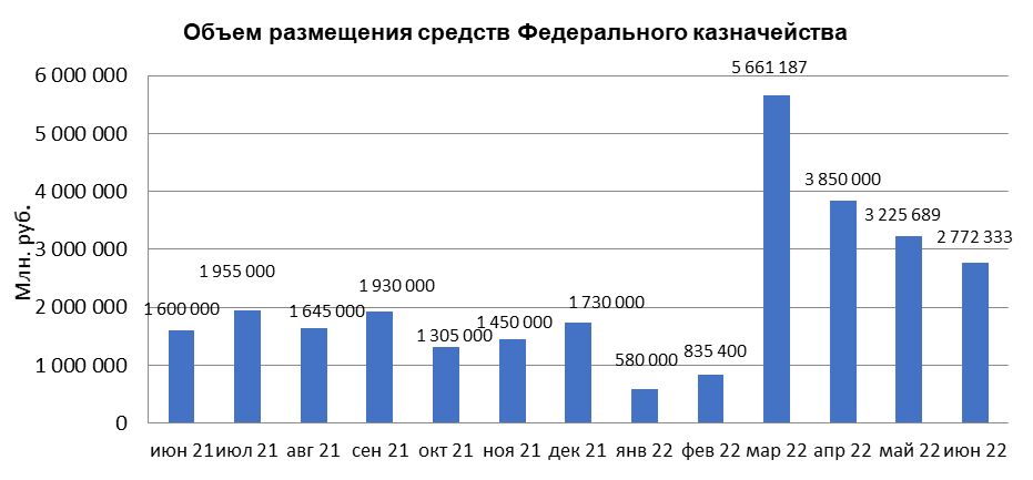 В июне 2022 г. объем размещения средств Федерального казначейства в депозиты кредитных организаций с использованием информационных программно-технических средств СПВБ, составил 2 772,3 млрд. руб., в мае 2022 года - 3 225,6 млрд. руб.
