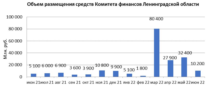 В июне 2022 года объем размещения средств Комитета финансов Ленинградской области в депозиты кредитных организаций с использованием информационных программно-технических средств СПВБ составил 10,2 млрд. руб., в мае 2022 года – 32,4 млрд. руб.