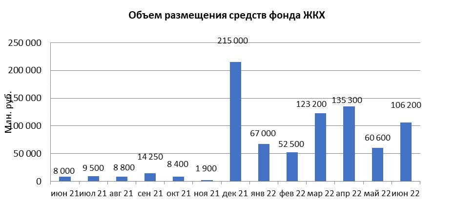 В июне 2022 года объем размещения средств государственной корпорации - Фонд содействия реформированию жилищно-коммунального хозяйства в депозиты кредитных организаций с использованием информационных программно-технических средств СПВБ составил 106,2 млрд. руб., в мае 2022 года – 60,6 млрд. руб.