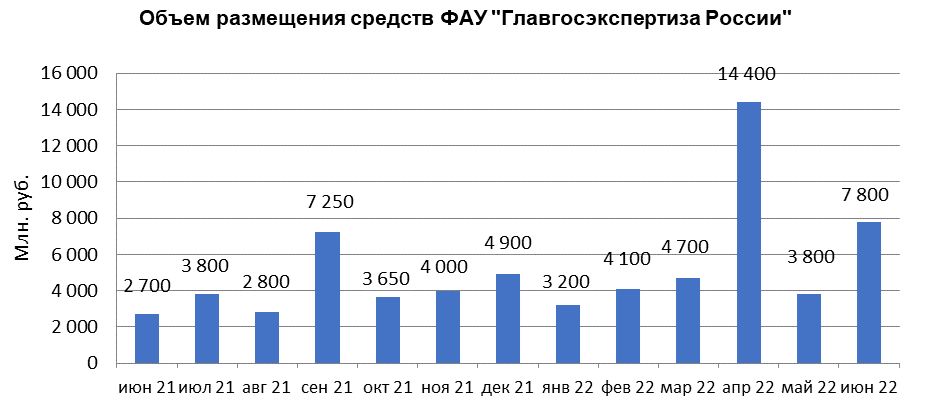 В июне 2022 г. объем размещения средств ФАУ «Главгосэкспертиза России» в депозиты кредитных организаций с использованием информационных программно-технических средств СПВБ составил 7,8 млрд. руб., в мае 2022 года - 3,8 млрд. руб.