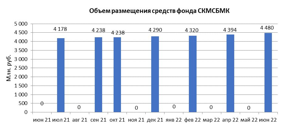 В июне 2022 года объем размещения средств некоммерческой организации “Фонд содействия кредитованию малого и среднего бизнеса, микрокредитная компания” в депозиты кредитных организаций с использованием информационных программно-технических средств СПВБ составил 4,5 млрд. руб., в мае 2022 года размещение не осуществлялось.