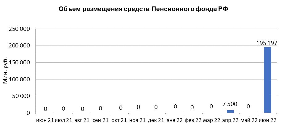 В июне 2022 года объем размещения средств организации Пенсионный фонд России в депозиты кредитных организаций с использованием информационных программно-технических средств СПВБ составил 195,2 млрд.руб., в мае 2022 года размещение не осуществлялось.