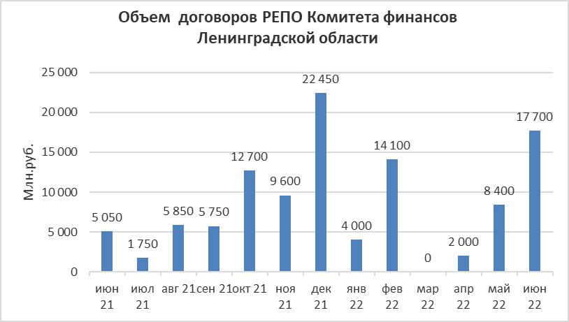 Объем заключенных договоров РЕПО Комитета финансов Ленинградской области с кредитными организациями с использованием информационных программно-технических средств СПВБ в июне 2022 года составил 17,7 млрд.руб, в мае 2022 года – 8,4 млрд.руб.