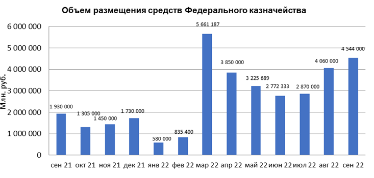 В сентябре 2022 г. объем размещения средств Федерального казначейства в депозиты кредитных организаций с использованием информационных программно-технических средств СПВБ составил 4 544 млрд. руб., в августе 2022 года - 4 060 млрд. руб.
