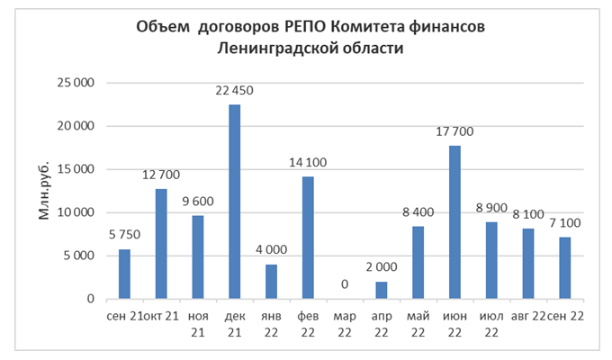Объем заключенных договоров РЕПО Комитета финансов Ленинградской области с кредитными организациями с использованием информационных программно-технических средств СПВБ в сентябре 2022 года составил 7,1 млрд. руб., в августе 2022 года – 8,1 млрд. руб.