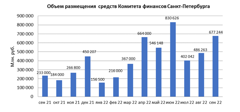 В сентябре 2022 года объем размещения средств Комитета финансов Санкт-Петербурга в депозиты кредитных организаций с использованием информационных программно-технических средств СПВБ составил 677,2 млрд. руб., в августе 2022 года – 486,3 млрд. руб.