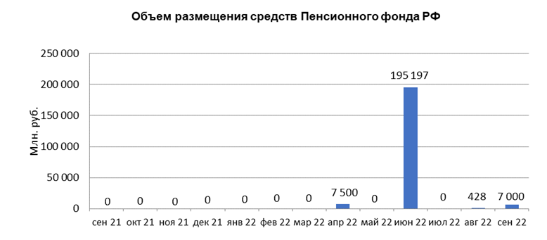 В сентябре 2022 года объем размещения средств организации Пенсионный фонд России в депозиты кредитных организаций с использованием информационных программно-технических средств СПВБ составил 7 млрд. руб., в августе 2022 года - 0,4 млрд. руб.