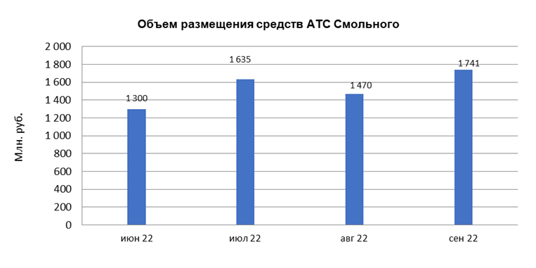 В сентябре 2022 года объем размещение средств организации СПб ГУП «АТС Смольного» в депозиты кредитных организаций с использованием информационных программно-технических средств СПВБ составил 1,7 млрд. руб., в августе 2022 года - 1,5 млрд. руб.