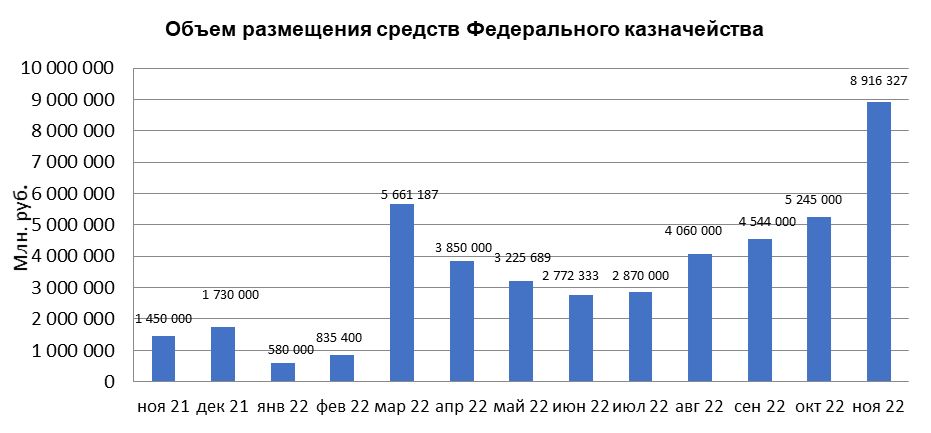 В ноябре 2022 г. объем размещения средств Федерального казначейства в депозиты кредитных организаций с использованием информационных программно-технических средств СПВБ составил 8 916,3 млрд. руб., в октябре 2022 года - 5 245 млрд. руб.