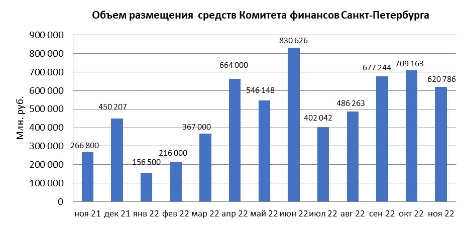 В ноябре 2022 года объем размещения средств Комитета финансов Санкт-Петербурга в депозиты кредитных организаций с использованием информационных программно-технических средств СПВБ составил 620,8 млрд. руб., в октябре 2022 года – 709,2 млрд. руб.