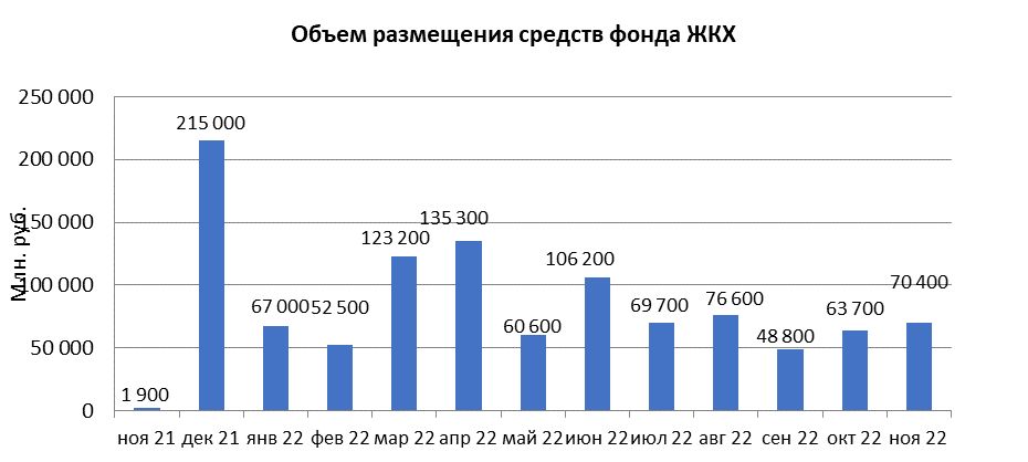 В ноябре 2022 года объем размещения средств государственной корпорации - Фонд содействия реформированию жилищно-коммунального хозяйства в депозиты кредитных организаций с использованием информационных программно-технических средств СПВБ составил 70,4 млрд. руб., в октябре 2022 года – 63,7 млрд. руб.