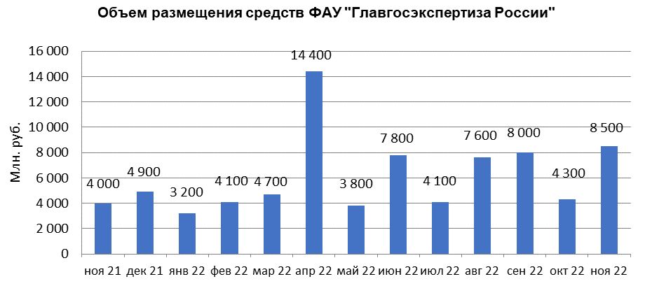 В ноябре 2022 г. объем размещения средств ФАУ «Главгосэкспертиза России» в депозиты кредитных организаций с использованием информационных программно-технических средств СПВБ составил 8,5 млрд. руб., в октябре 2022 года – 4,3 млрд. руб.