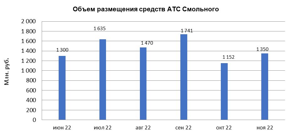 В ноябре 2022 года объем размещение средств организации СПб ГУП «АТС Смольного» в депозиты кредитных организаций с использованием информационных программно-технических средств СПВБ составил 1,4 млрд. руб., в октябре 2022 года - 1,2 млрд. руб.
