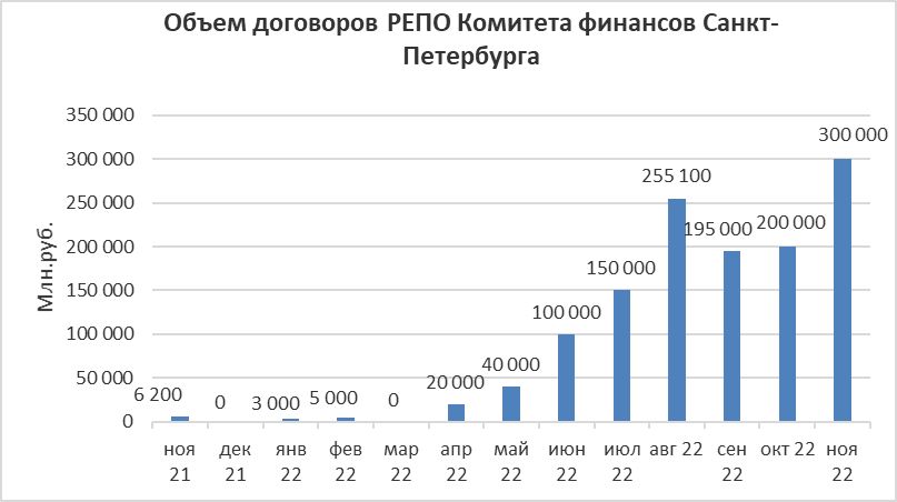 Объем заключенных договоров РЕПО Комитета финансов Санкт-Петербурга с кредитными организациями с использованием информационных программно-технических средств СПВБ в ноябре 2022 года составил 300 млрд. руб., в октябре 2022 года – 200 млрд. руб.