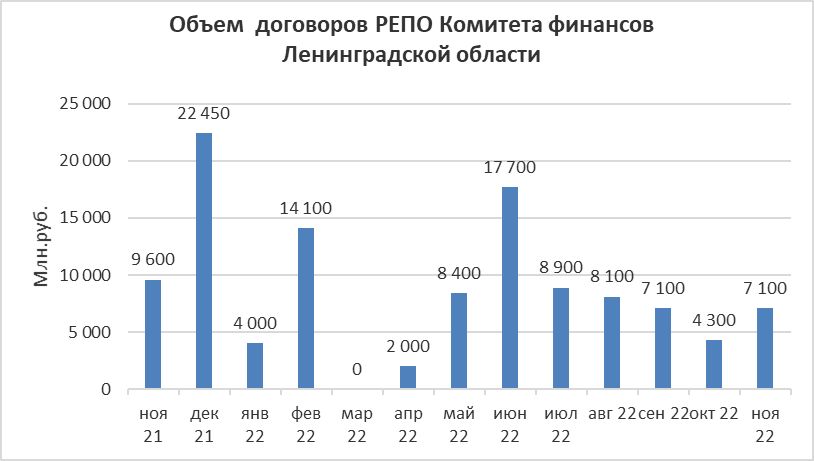 Объем заключенных договоров РЕПО Комитета финансов Ленинградской области с кредитными организациями с использованием информационных программно-технических средств СПВБ в ноябре 2022 года составил 7,1 млрд. руб., в октябре 2022 года – 4,3 млрд. руб.