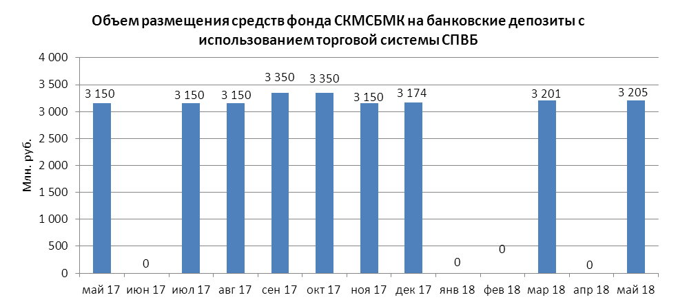 Объем размещения временно свободных средств некоммерческой организации “Фонд содействия кредитованию малого и среднего бизнеса, микрокредитная компания” на банковские депозиты в уполномоченных банках с использованием торговой системы СПВБ в мае 2018 года составил 3,205 млрд. руб.