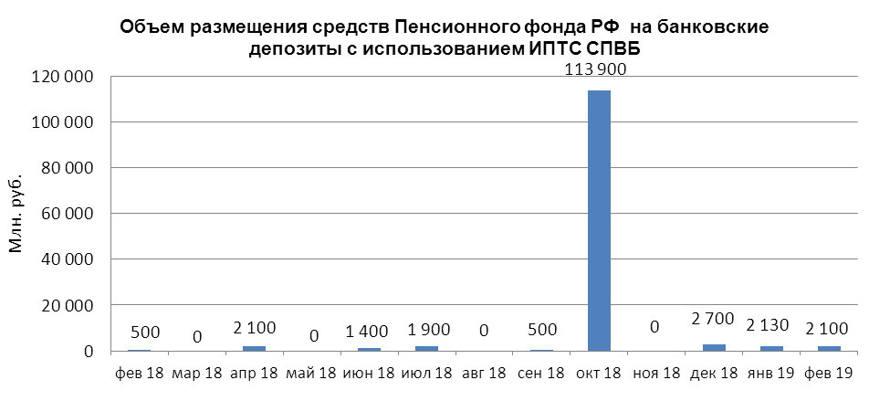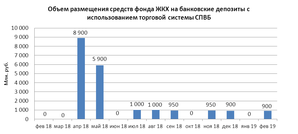 В феврале 2019 года объем размещения временно свободных средств государственной корпорации - Фонд содействия реформированию жилищно-коммунального хозяйства на депозиты в уполномоченных банках с использованием торговой системы СПВБ составил 0,900 млрд. руб.