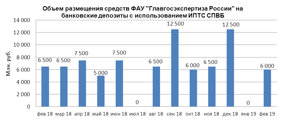 В феврале 2019 г. объем размещения средств ФАУ «Главгосэкспертиза России» на банковские депозиты в уполномоченных банках составил 6,000 млрд. руб.