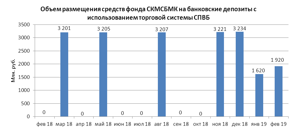 Объем размещения временно свободных средств некоммерческой организации “Фонд содействия кредитованию малого и среднего бизнеса, микрокредитная компания” на банковские депозиты в уполномоченных банках с использованием торговой системы СПВБ в феврале 2019 года составил 1,920 млрд. руб., в январе 2019 года - 1,620 млрд. руб.