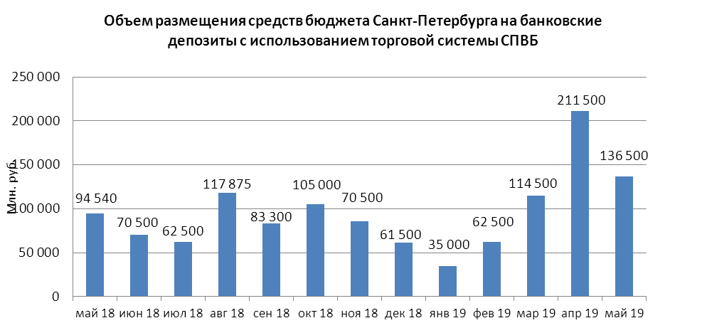 В мае 2019 года объем размещения средств бюджета Санкт-Петербурга на депозиты в уполномоченных банках с использованием торговой системы СПВБ составил 136,500 млрд. руб., в апреле 2019 года – 211,500 млрд. руб.