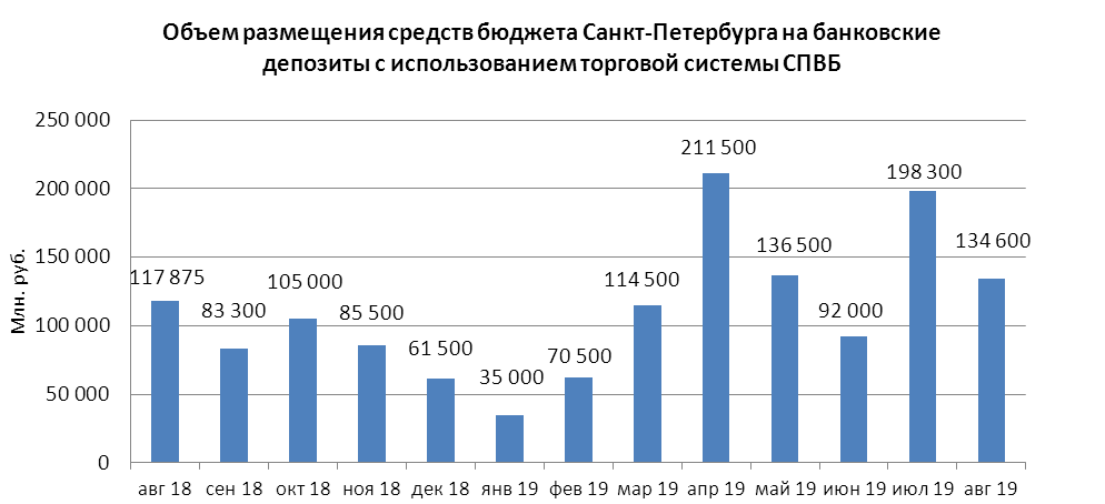 В августе 2019 года объем размещения средств бюджета Санкт-Петербурга на депозиты в уполномоченных банках с использованием торговой системы СПВБ составил 134,600 млрд. руб., в июле 2019 года – 198,300 млрд. руб.