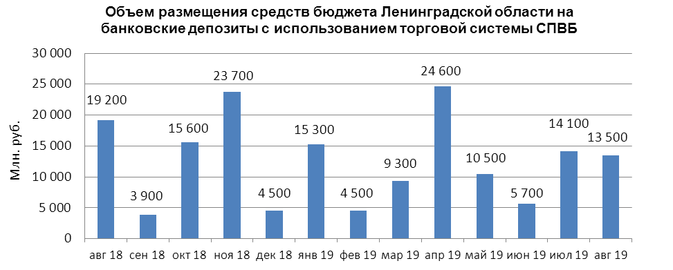 В августе 2019 г. объем размещения средств бюджета Ленинградской области на банковские депозиты в уполномоченных банках с использованием торговой системы СПВБ составил 13,500 млрд. руб., в июле 2019 года - 14,100 млрд. руб.
