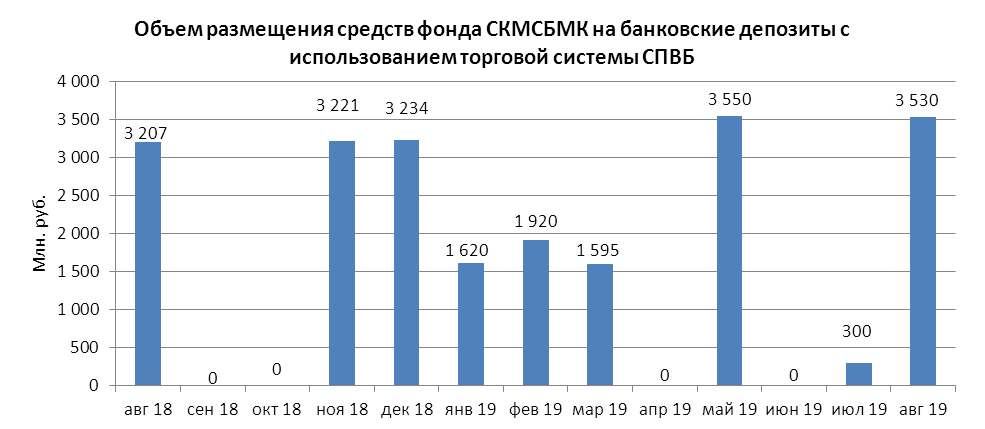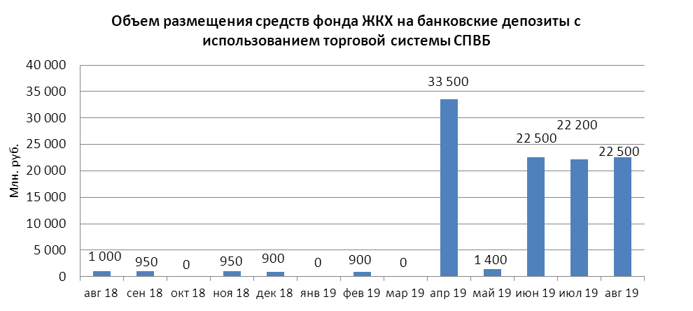 В августе 2019 года объем размещения временно свободных средств государственной корпорации - Фонд содействия реформированию жилищно-коммунального хозяйства на депозиты в уполномоченных банках с использованием торговой системы СПВБ составил 22,500 млрд. руб., в июле 2019 года - 22,200 млрд. руб.