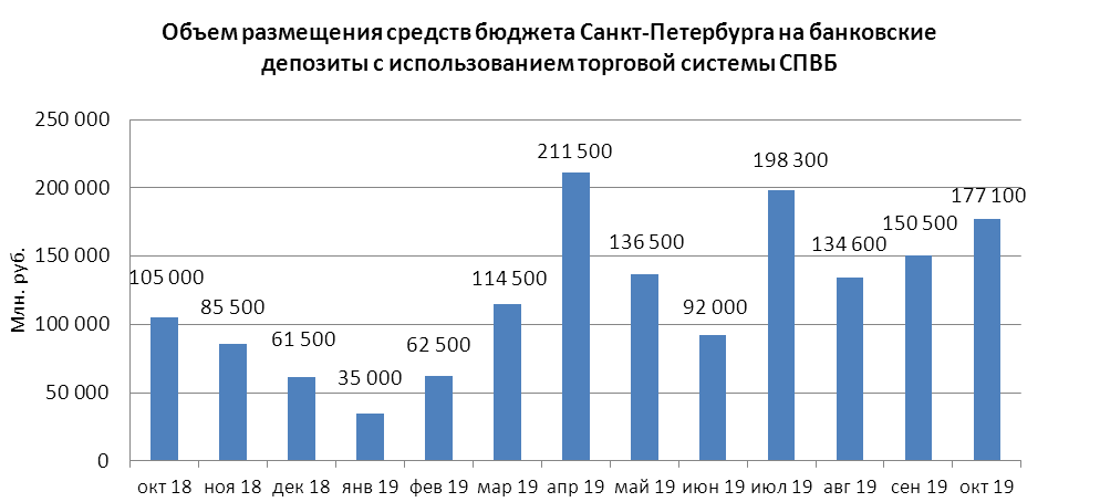 В октябре 2019 года объем размещения средств бюджета Санкт-Петербурга на депозиты в уполномоченных банках с использованием торговой системы СПВБ составил 177,100 млрд. руб., в сентябре 2019 года – 150,500 млрд. руб.