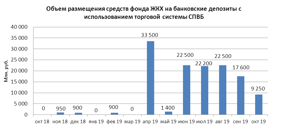 В октябре 2019 года объем размещения временно свободных средств государственной корпорации - Фонд содействия реформированию жилищно-коммунального хозяйства на депозиты в уполномоченных банках с использованием торговой системы СПВБ составил 9,250 млрд. руб., в сентябре 2019 года - 17,600 млрд. руб.