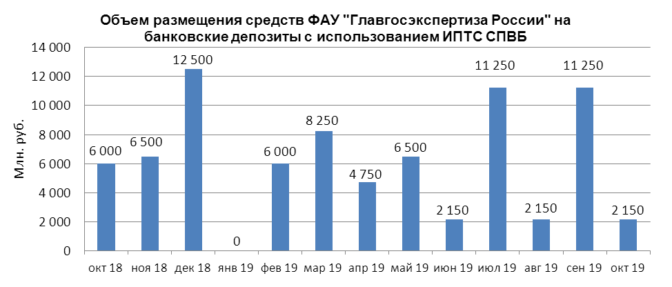 В октябре 2019 г. объем размещения средств ФАУ «Главгосэкспертиза России» на банковские депозиты в уполномоченных банках составил 2,150 млрд. руб., в сентябре 2019 года - 11,250 млрд. руб.