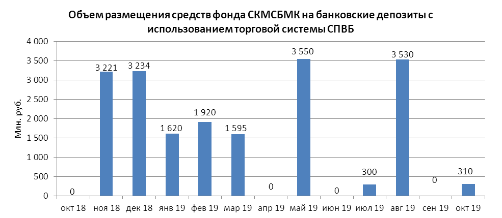 Объем размещения временно свободных средств некоммерческой организации “Фонд содействия кредитованию малого и среднего бизнеса, микрокредитная компания” на банковские депозиты в уполномоченных банках с использованием торговой системы СПВБ в октябре 2019 года составил 0,310 млрд. руб.
