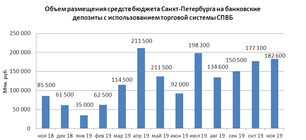 В ноябре 2019 года объем размещения средств бюджета Санкт-Петербурга на депозиты в уполномоченных банках с использованием торговой системы СПВБ составил 182,600 млрд. руб., в октябре 2019 года – 177,100 млрд. руб.