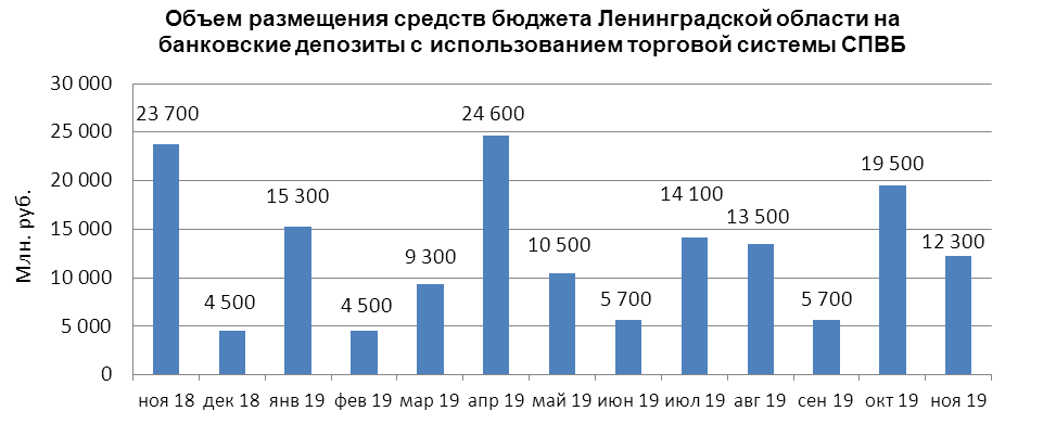 В ноябре 2019 г. объем размещения средств бюджета Ленинградской области на банковские депозиты в уполномоченных банках с использованием торговой системы СПВБ составил 12,300 млрд. руб., в октябре 2019 года - 19,500 млрд. руб.