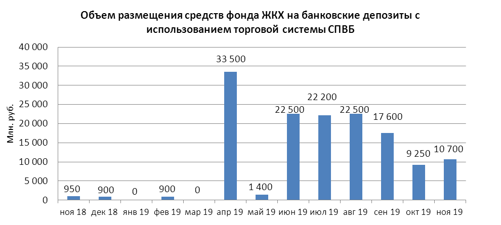 В ноябре 2019 года объем размещения временно свободных средств государственной корпорации - Фонд содействия реформированию жилищно-коммунального хозяйства на депозиты в уполномоченных банках с использованием торговой системы СПВБ составил 10,700 млрд. руб., в октябре 2019 года - 9,250 млрд. руб.