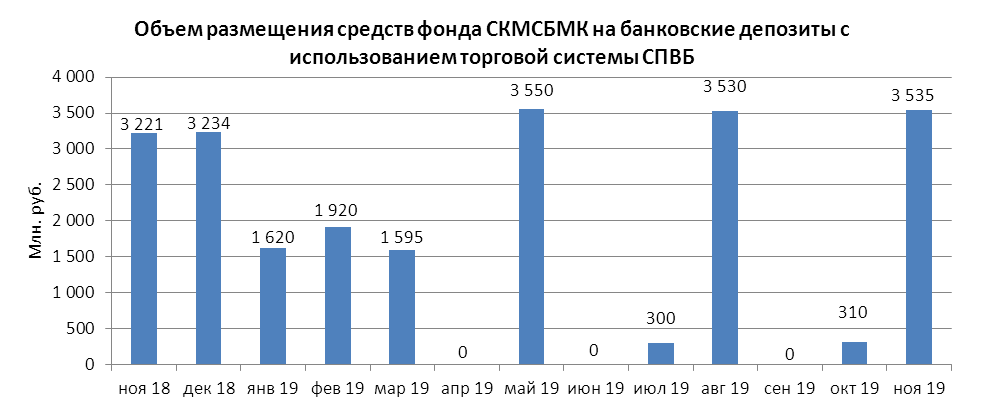 Объем размещения временно свободных средств некоммерческой организации “Фонд содействия кредитованию малого и среднего бизнеса, микрокредитная компания” на банковские депозиты в уполномоченных банках с использованием торговой системы СПВБ в ноябре 2019 года составил 3,535 млрд. руб., в октябре 2019 года составил 0,310 млрд. руб.