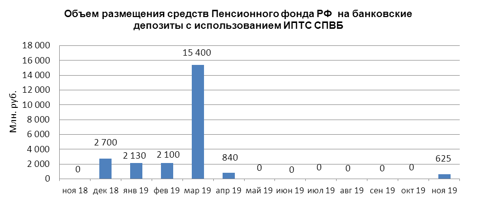В ноябре 2019 г. объем размещения средств Пенсионного фонда Российской Федерации на банковские депозиты, осуществленного Пенсионным фондом с использованием информационных программно-технических средств СПВБ, составил 0,625 млрд. руб.