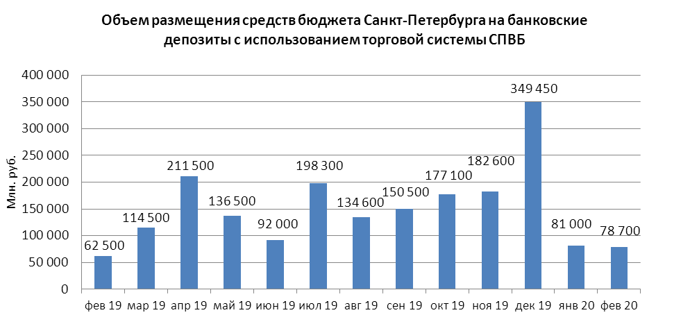 В феврале 2020 года объем размещения средств бюджета Санкт-Петербурга на депозиты в уполномоченных банках с использованием торговой системы СПВБ составил 78,700 млрд. руб., в январе 2020 года – 81,000 млрд. руб.