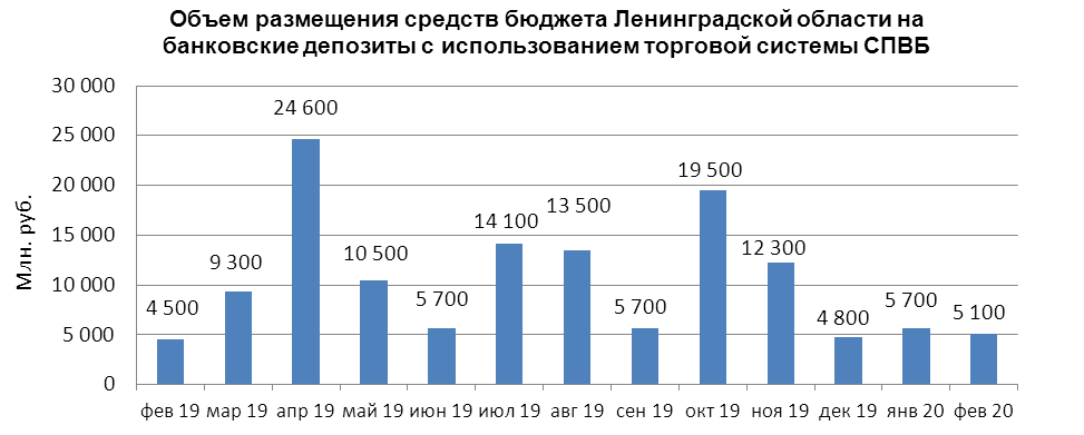 В феврале 2020 г. объем размещения средств бюджета Ленинградской области на банковские депозиты в уполномоченных банках с использованием торговой системы СПВБ составил 5,100 млрд. руб., в январе 2020 года - 5,700 млрд. руб.
