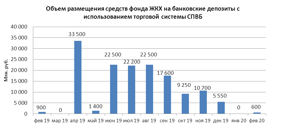 В феврале 2020 года объем размещения временно свободных средств государственной корпорации - Фонд содействия реформированию жилищно-коммунального хозяйства на депозиты в уполномоченных банках с использованием торговой системы СПВБ составил 0,600 млрд. руб.