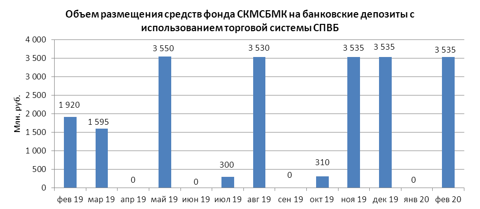 Объем размещения временно свободных средств некоммерческой организации “Фонд содействия кредитованию малого и среднего бизнеса, микрокредитная компания” на банковские депозиты в уполномоченных банках с использованием торговой системы СПВБ в феврале 2020 года составил 3,535 млрд. руб.